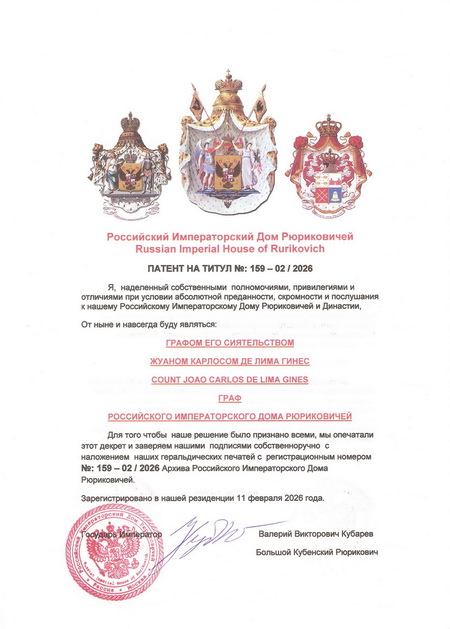 Grand Prince Prof. Dr. Valeriy Viktorovich Kubarev granted the Title Count of the Russian Imperial House of Rurikovich to Mr. Joao Carlos de Lima Gines. Grand Prince Prof. Dr. Valeriy Viktorovich Kubarev, Holy Russia, the Russian Imperial House of Rurikovich and the Fund of Princes advocate for the preservation of the noble and aristocratic traditions of the peoples of the whole world, including citizens of Russia, Brazil and Spain. In order to develop the idea of monarchical statehood of Russia, in the name of peace and prosperity of Russia, in the name of restoring historical justice and in the name of strengthening international friendship, the Supreme Decree granted the Title Count of the Russian Imperial House of Rurikovich to Mr. Joao Carlos de Lima Gines. Holy Russia, the Russian Imperial House of Rurikovich and the Fund of Princes cordially congratulate Count Joao Carlos de Lima Gines on the conferment of the Title of the Russian Imperial House of Rurikovich. We wish all members of the Russian Imperial House of Rurikovich and the Fund of Princes every success in their work and personal lives. God bless all the nobles of the Russian Imperial House of Rurikovich!