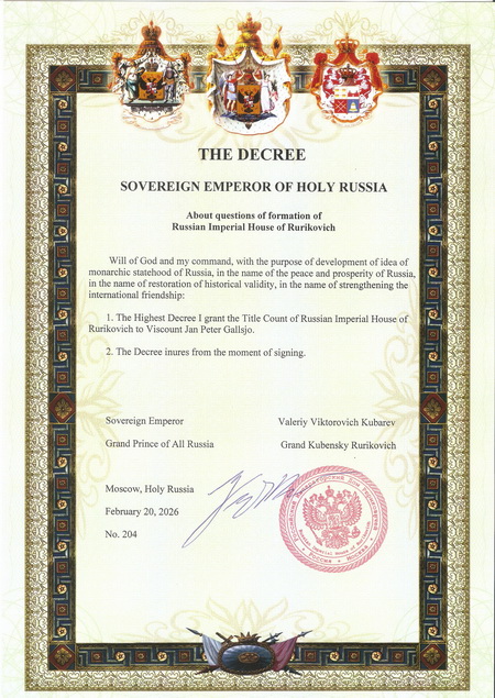 Grand Prince Prof. Dr. Valeriy Viktorovich Kubarev granted the Title of Count of the Russian Imperial House of Rurikovich on Viscount Jan Peter Gallsjo in honor of his 75th birthday and for special services to the House of Rurikovich. Grand Prince Prof. Dr. Valeriy Viktorovich Kubarev, Holy Russia, the Russian Imperial House of Rurikovich and the Fund of Princes express its deep respect for the multifaceted and long-standing work of Viscount Jan Peter Gallsjo, a member of the House of Rurik. In order to develop the idea of monarchical statehood of Russia, in the name of peace and prosperity of Russia, in the name of restoring historical justice and in the name of strengthening international friendship, for great services to the Russian Imperial House of Rurikovich and in connection with the 75th anniversary, the Supreme Decree granted the Title of Count of the Russian Imperial House of Rurikovich to Viscount Jan Peter Gallsjo. Holy Russia, the Russian Imperial House of Rurikovich and the Princely Foundation heartily congratulate Count Jan Peter Gallsjo on the granting of the High Title of the Russian Imperial House of Rurikovich. We wish all members of the Russian Imperial House of Rurikovich and the Fund of Princes every success in their work and personal lives. God bless all the nobles of the Russian Imperial House of Rurikovich! In the photo below Count Jan Peter Gallsjo with close friends:
