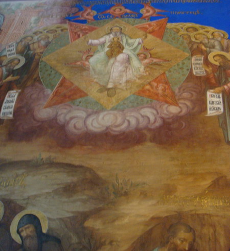 Kubrus of the God Father, the God Son and Sacred Spirit. The main dome of the Spas-Preobrazhenskiy cathedral, Suzdal. Icon painter by Gury Nikitin (1620-1691).