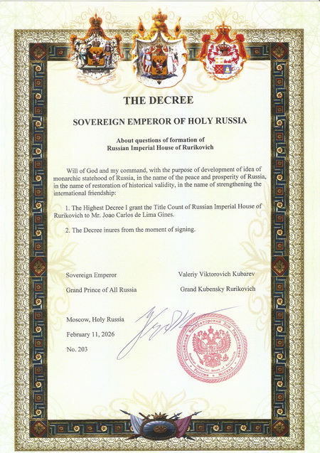 Grand Prince Prof. Dr. Valeriy Viktorovich Kubarev granted the Title Count of the Russian Imperial House of Rurikovich to Mr. Joao Carlos de Lima Gines. Grand Prince Prof. Dr. Valeriy Viktorovich Kubarev, Holy Russia, the Russian Imperial House of Rurikovich and the Fund of Princes advocate for the preservation of the noble and aristocratic traditions of the peoples of the whole world, including citizens of Russia, Brazil and Spain. In order to develop the idea of monarchical statehood of Russia, in the name of peace and prosperity of Russia, in the name of restoring historical justice and in the name of strengthening international friendship, the Supreme Decree granted the Title Count of the Russian Imperial House of Rurikovich to Mr. Joao Carlos de Lima Gines. Holy Russia, the Russian Imperial House of Rurikovich and the Fund of Princes cordially congratulate Count Joao Carlos de Lima Gines on the conferment of the Title of the Russian Imperial House of Rurikovich. We wish all members of the Russian Imperial House of Rurikovich and the Fund of Princes every success in their work and personal lives. God bless all the nobles of the Russian Imperial House of Rurikovich!