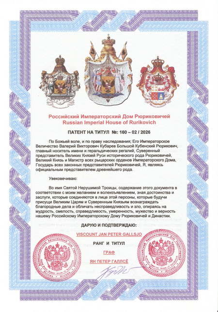 Grand Prince Prof. Dr. Valeriy Viktorovich Kubarev granted the Title of Count of the Russian Imperial House of Rurikovich on Viscount Jan Peter Gallsjo in honor of his 75th birthday and for special services to the House of Rurikovich. Grand Prince Prof. Dr. Valeriy Viktorovich Kubarev, Holy Russia, the Russian Imperial House of Rurikovich and the Fund of Princes express its deep respect for the multifaceted and long-standing work of Viscount Jan Peter Gallsjo, a member of the House of Rurik. In order to develop the idea of monarchical statehood of Russia, in the name of peace and prosperity of Russia, in the name of restoring historical justice and in the name of strengthening international friendship, for great services to the Russian Imperial House of Rurikovich and in connection with the 75th anniversary, the Supreme Decree granted the Title of Count of the Russian Imperial House of Rurikovich to Viscount Jan Peter Gallsjo. Holy Russia, the Russian Imperial House of Rurikovich and the Princely Foundation heartily congratulate Count Jan Peter Gallsjo on the granting of the High Title of the Russian Imperial House of Rurikovich. We wish all members of the Russian Imperial House of Rurikovich and the Fund of Princes every success in their work and personal lives. God bless all the nobles of the Russian Imperial House of Rurikovich! In the photo below Count Jan Peter Gallsjo with close friends: