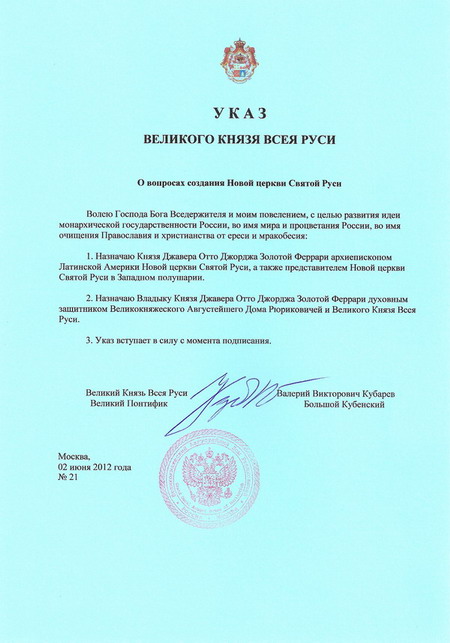 Князь Джавер Отто Джордж Золотой Феррари назначен архиепископом и Владыкой Новой церкви Святой Руси в Латинской Америке. Новыми участниками Фонда «Княжеский» и Ассамблеи Князей стали Принцесса Ребекка Анн Тюдор и Князь Маркку Комонен Рюрикович. Фонд «Княжеский» и Великокняжеский Августейший Дом Рюриковичей в России с радостью и гордостью сообщает мировой общественности о присоединении к нашим структурам представителей международной родовой аристократии из США и Финляндии – Принцессы Ребекки Анн Тюдор и Князя Маркку Комонена Рюриковича. Мы также с радостью и гордостью сообщаем об утверждении на своем посту архиепископа и Владыки (Лорда) Новой церкви Святой Руси в Латинской Америке Князя Джавера Отто Джорджа Золотой Феррари. Желаем новому Владыке Латинской Америки всяческих успехов на ниве служения Богу, распространения веры Христовой и процветания Новой церкви Святой Руси во всем мире. Великий Князь Всея Руси и Великий Понтифик Новой церкви Святой Руси Валерий Викторович Кубарев подписал Указ № 21 от 02.06.2012 об этом назначении. Текст Указа: У К А З ВЕЛИКОГО КНЯЗЯ ВСЕЯ РУСИ О вопросах создания Новой церкви Святой Руси Волею Господа Бога Вседержителя и моим повелением, с целью развития идеи монархической государственности России, во имя мира и процветания России, во имя очищения Православия и христианства от ереси и мракобесия: 1. Назначаю Князя Джавера Отто Джорджа Золотой Феррари архиепископом Латинской Америки Новой церкви Святой Руси, а также представителем Новой церкви Святой Руси в Западном полушарии. 2. Назначаю Владыку Князя Джавера Отто Джорджа Золотой Феррари духовным защитником Великокняжеского Августейшего Дома Рюриковичей и Великого Князя Всея Руси.