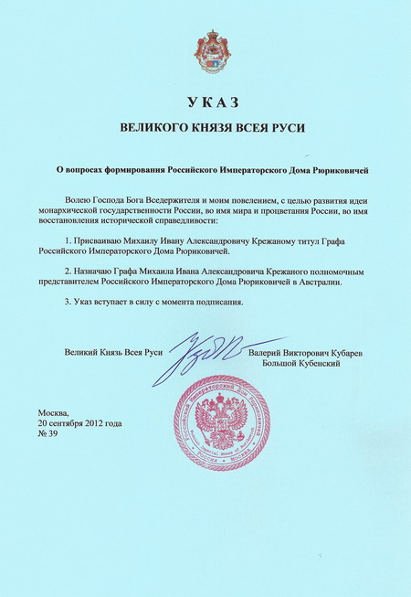 Присвоены титулы Графа Российского Императорского Дома Рюриковичей Доктору Диркеу Ибалдо Фалкао (Бразилия) и Михаилу Крежаному (Австралия). Доктор Диркеу Ибалдо Фалкао назначен епископом Новой церкви Святой Руси в Бразилии. С радостью и гордостью Российский Императорский Дом Рюриковичей сообщает мировой общественности о присвоении титулов Графа Российского Императорского Дома Рюриковичей великолепным и достойным рыцарям. Указом № 38 от 20.09.2012 удостоен титула Графа Российского Императорского Дома Рюриковичей Доктор Диркеу Ибалдо Фалкао, который также был назначен епископом Новой церкви Святой Руси в Бразилии по рекомендации и решению Архиепископа Великого Князя Доктора Джавера Отто Джорджа Золотой Феррари. Указом № 39 от 20.09.2012 удостоен титула Графа Российского Императорского Дома Рюриковичей рыцарь Михаил Иван Александрович Крежаный, который также был назначен полномочным представителем Российского Императорского Дома Рюриковичей в Австралии. Поздравляем достойных рыцарей с этими титулами и назначениями.