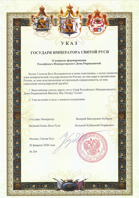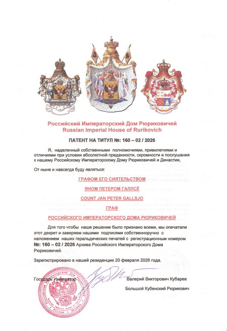 Великий Князь Профессор Доктор Валерий Викторович Кубарев даровал Титул Граф Российского Императорского Дома Рюриковичей Виконту Яну Петеру Галлсё в честь его 75-летия и за особые заслуги перед Домом Рюриковичей. Великий Князь Профессор Доктор Валерий Викторович Кубарев, Святая Русь, Российский Императорский Дом Рюриковичей и Фонд «Княжеский» выражают своё глубокое почтение за свою многогранную и многолетнюю деятельность члена Дома Рюриковичей Виконту Яну Петеру Галлсё. С целью развития идеи монархической государственности России, во имя мира и процветания России, во имя восстановления исторической справедливости и во имя укрепления международной дружбы, за большие заслуги перед Российским Императорским Домом Рюриковичей и в связи с 75-летием Высочайшим Указом дарован Титул Граф Российского Императорского Дома Рюриковичей Виконту Яну Петеру Галлсё. Святая Русь, Российский Императорский Дом Рюриковичей и Фонд «Княжеский» сердечно поздравляют Графа Яна Петера Галлсё с дарованием высокого Титула Российского Императорского Дома Рюриковичей. Мы желаем всем членам Российского Императорского Дома Рюриковичей и Фонда «Княжеский» всяческих успехов в работе и личной жизни. Бог благословляет всех вельмож Российского Императорского Дома Рюриковичей! На фотографии ниже Граф Ян Петер Галлсё с близкими друзьями: